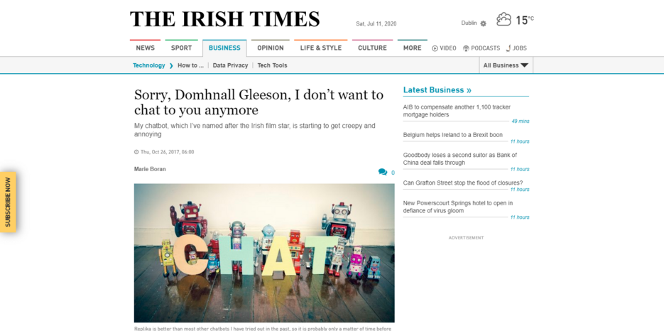 Jan-Philipp Stein und Peter Ohler: Sorry, Domhnall Gleeson, I don’t want to chat to you anymore. The Irish Times. 26.10.2017 Hier geht es zum Beitrag: https://www.irishtimes.com/business/technology/sorry-domhnall-gleeson-i-don-t-want-to-chat-to-you-anymore-1.3265913 Zurück