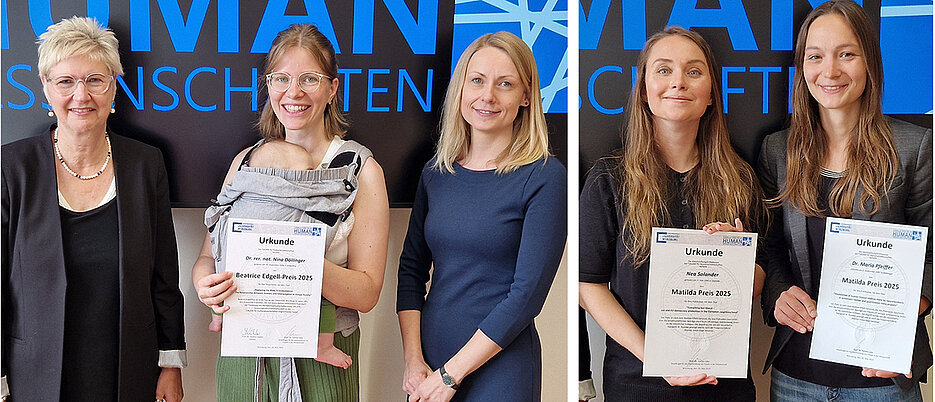 The Faculty of Human Sciences has awarded the Beatrice Edgell Prize 2025 to Dr. Nina Döllinger from the Department of Human-Computer-Media for her outstanding dissertation. In her research, she examined how using avatars in virtual reality affects self- and body perception, offering valuable insights for potential therapeutic applications. The Matilda Prize for the best scientific publications was awarded to Dr. Maria Pfeiffer and Nea Solander.