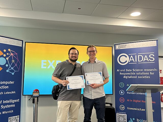 Christoph Jungmair (right) with his project: “Design and Development of Chat-Based AI-Agents for Reliable Document Retrieval in Technical Maintenance”